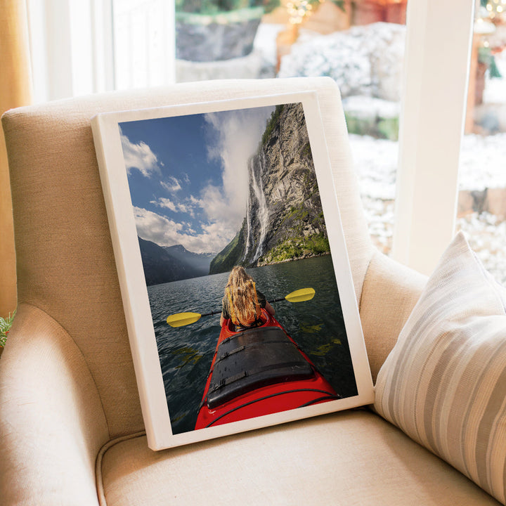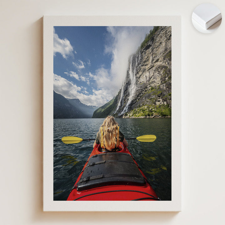 Nő kajakozik Geiranger-fjordban